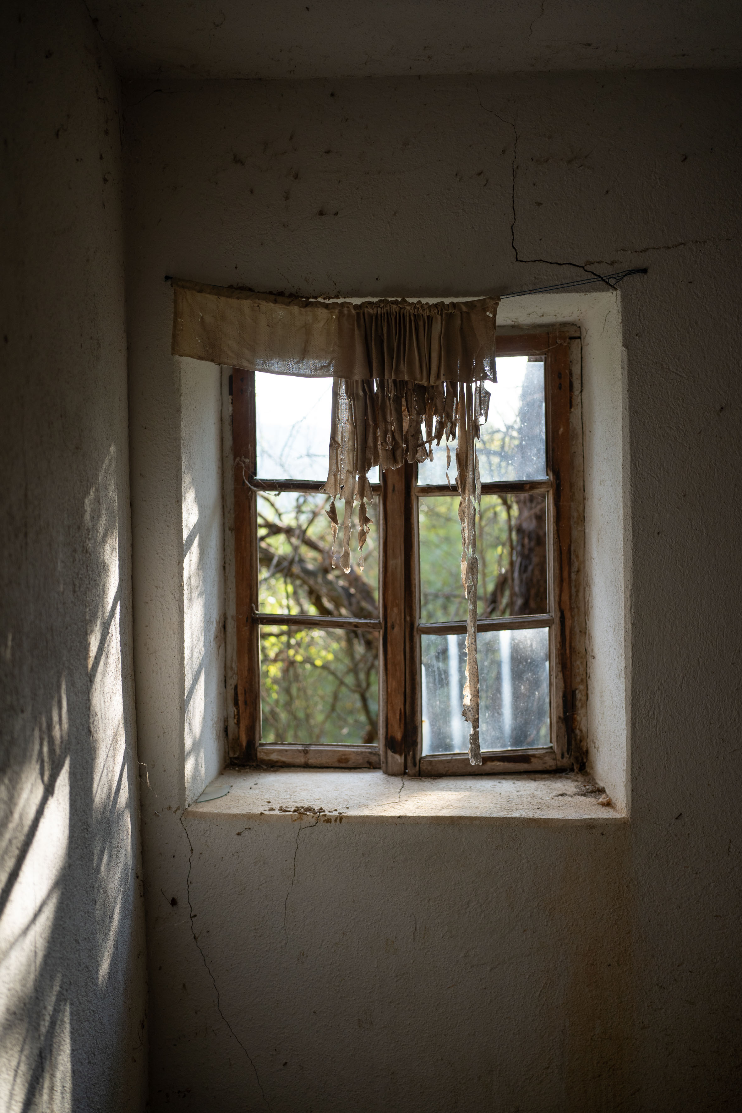 I cross the threshold into the room and the wooden floor creaks under my feet. The smell of dirt and damp wood fills my nose. Light shines through a small window and dust dances on a sunbeam. The only sign that the room was ever occupied, is the faded curtain in front of the window. Ivo walks over and says that his mother made it. He draws the curtain aside and looks out the window.